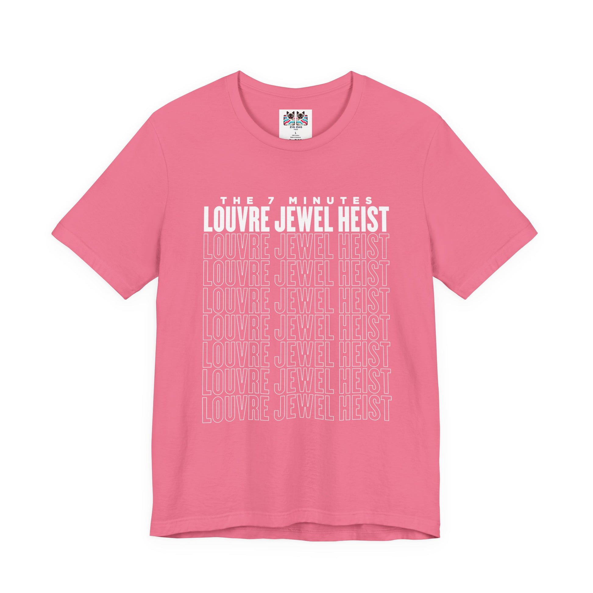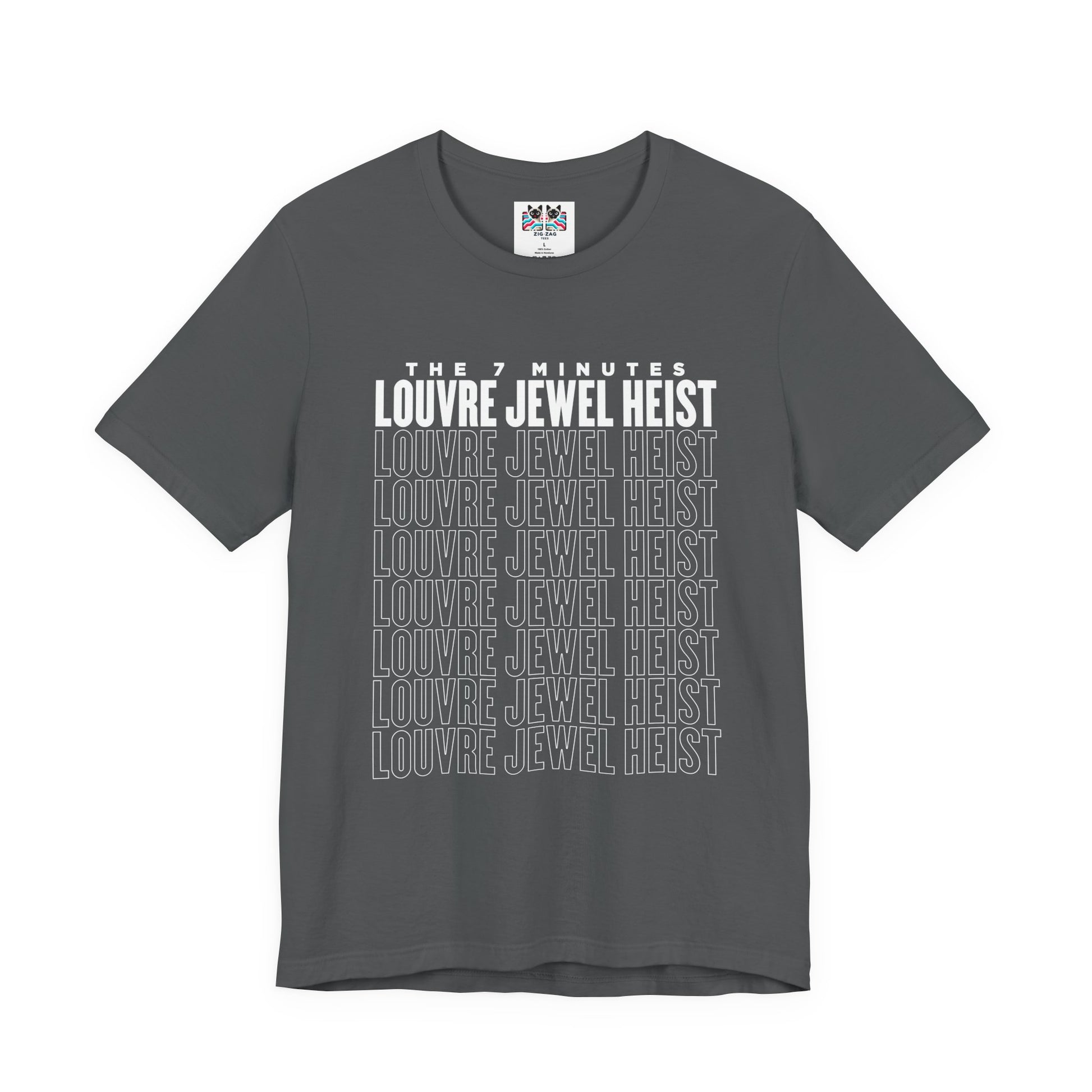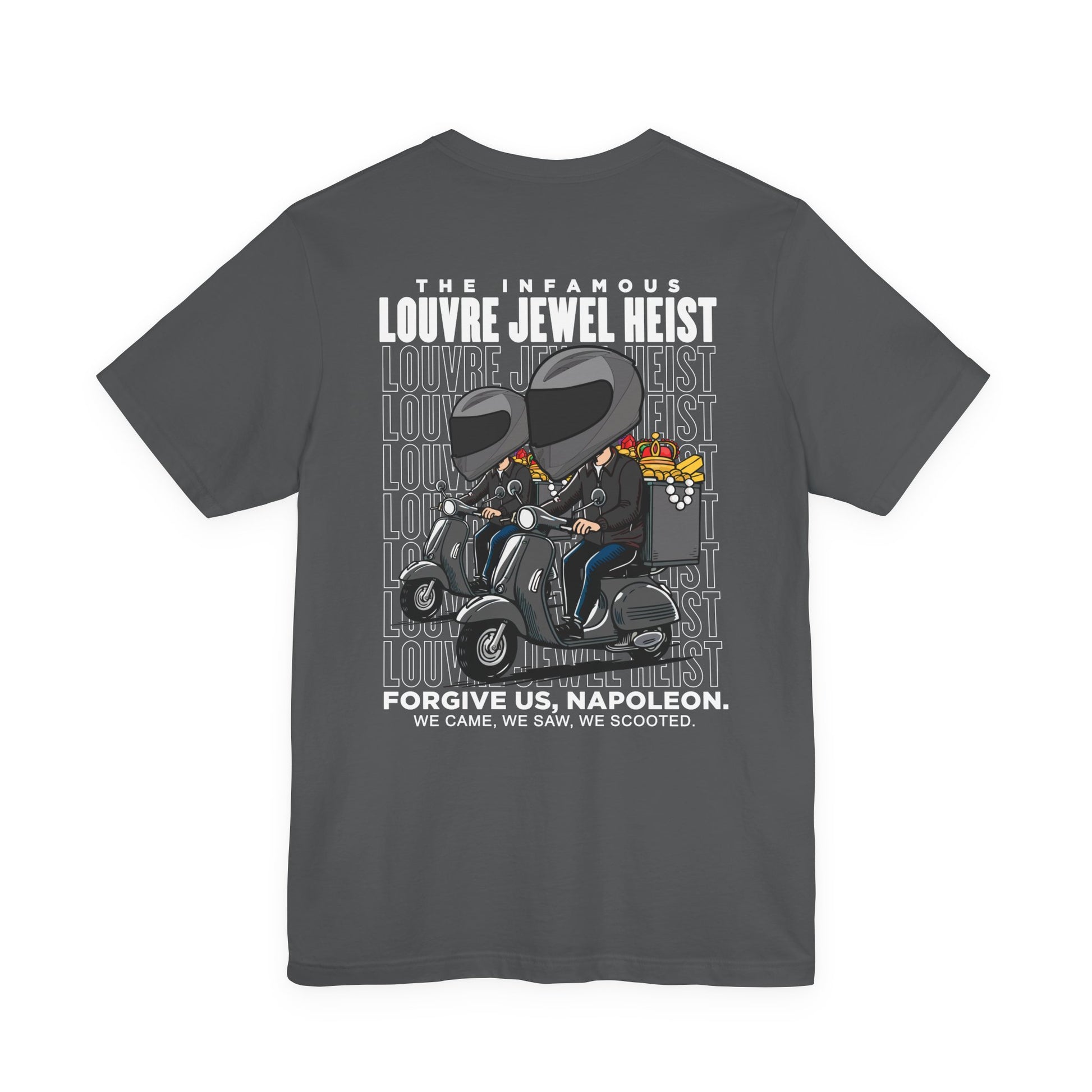 Show off your love for art history and clever capers with this eye-catching t-shirt inspired by the infamous Louvre robbery. The front displays bold text "THE 7 MINUTES LOUVRE JEWEL HEIST" above repeated outline-style "LOUVRE JEWEL HEIST" graphics, capturing the drama and speed of the real-life event. The large graphic features a cartoon thief making a flashy escape on a scooter with stolen jewels, alongside the playful headline: "THE INFAMOUS LOUVRE JEWEL HEIST." Below, it adds an extra wink to history buffs with "FORGIVE US, NAPOLEON. We Came, We Saw, We Scooted." This tee is perfect for fans of art, Paris, clever humor, or legendary heists.