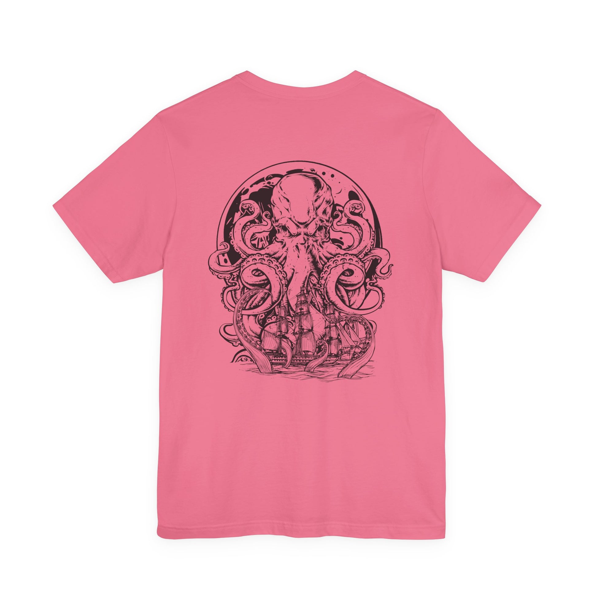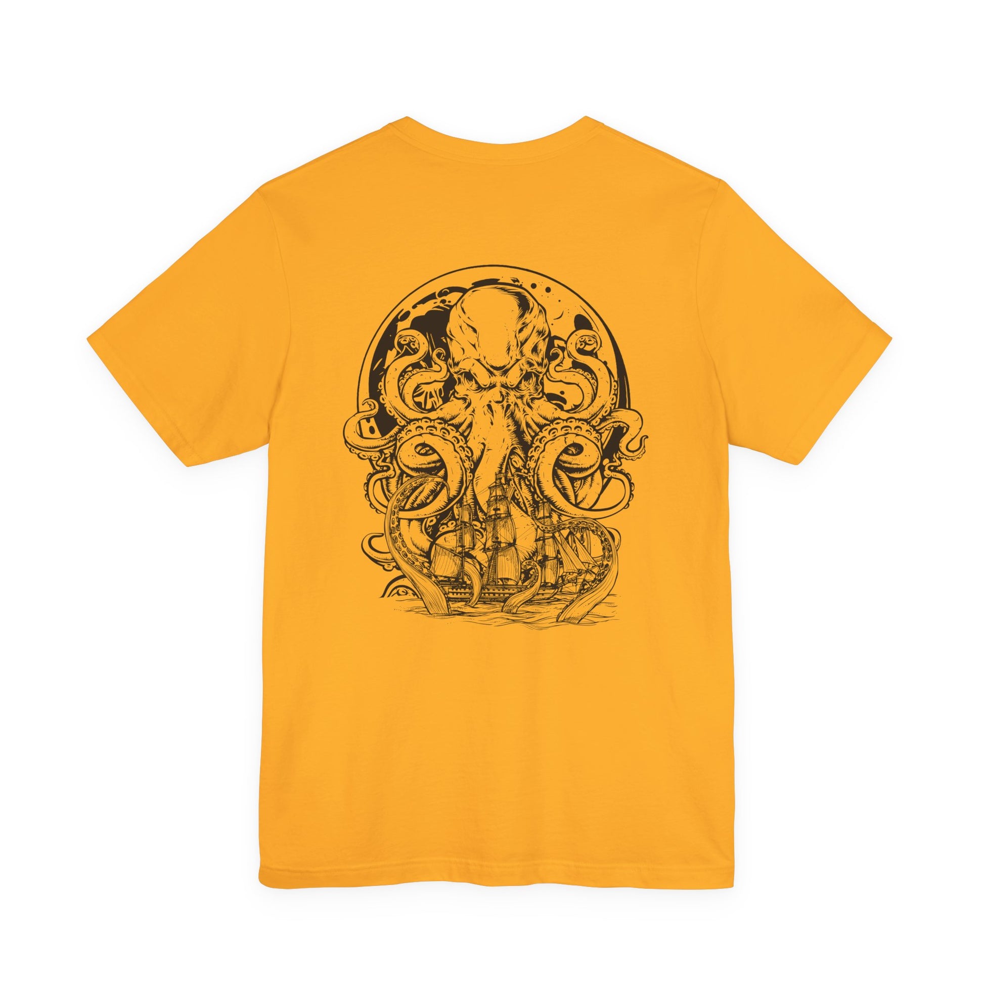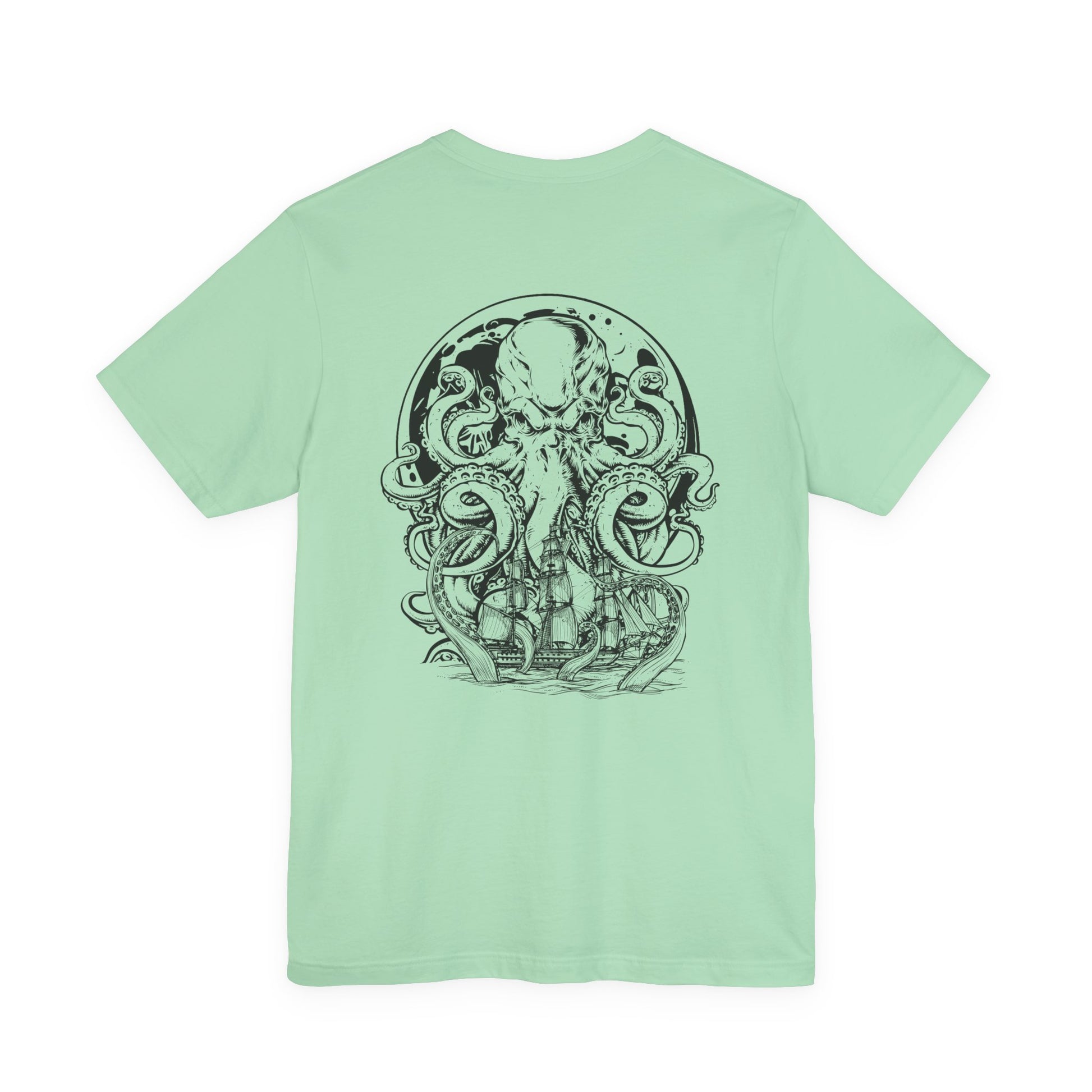 Unleash the depths with this epic Kraken t-shirt featuring a highly detailed sea monster illustration on the front with bold “The Kraken” text and layered lettering behind the tentacles. The back shows the full kraken rising from the ocean, wrapping its tentacles around a sailing ship in a dramatic black-and-white scene framed by the moon. Perfect for ocean lovers, nautical tattoo art fans, gamers, and mythic creature enthusiasts, this tee is great for everyday wear, conventions, concerts, or pirate-themed events.
