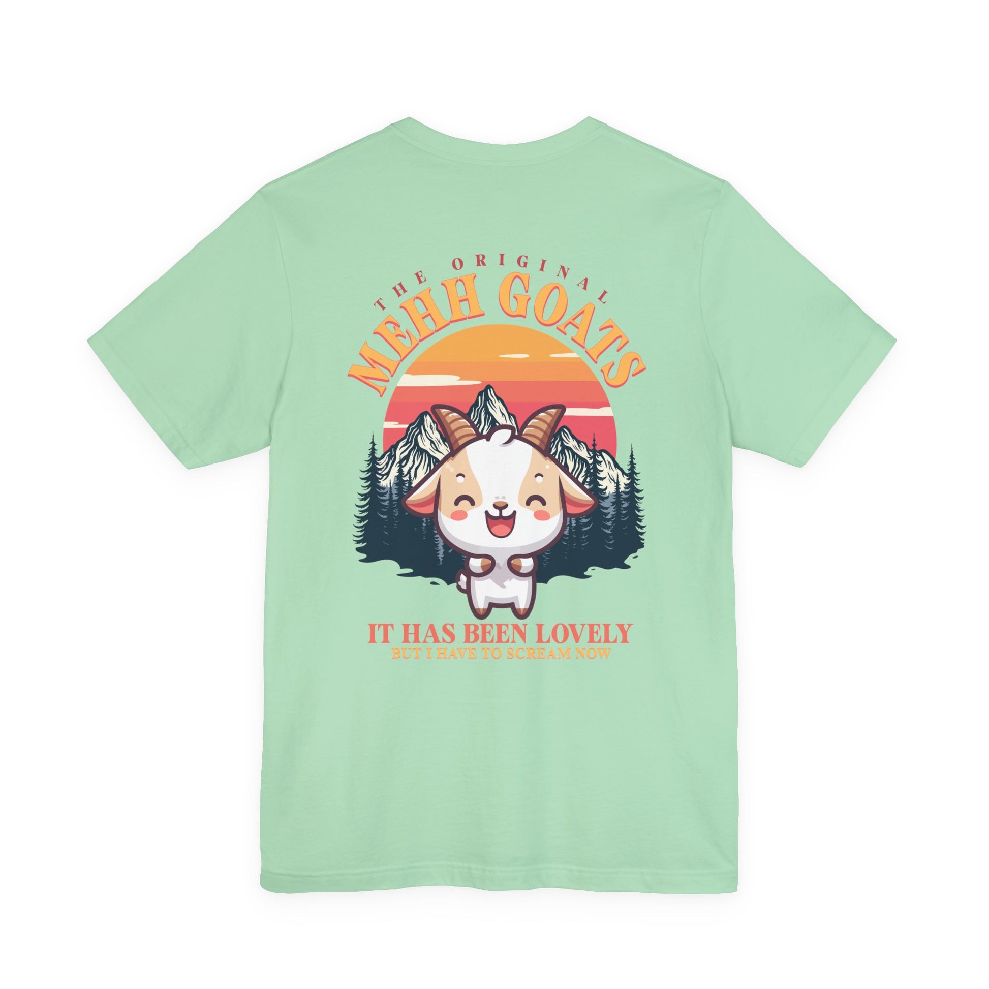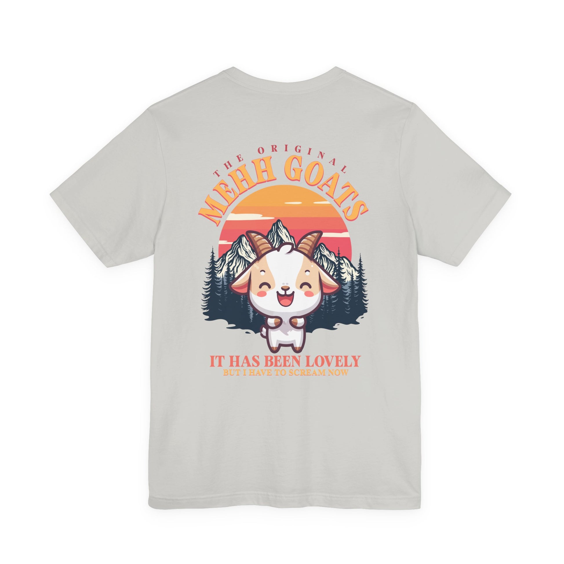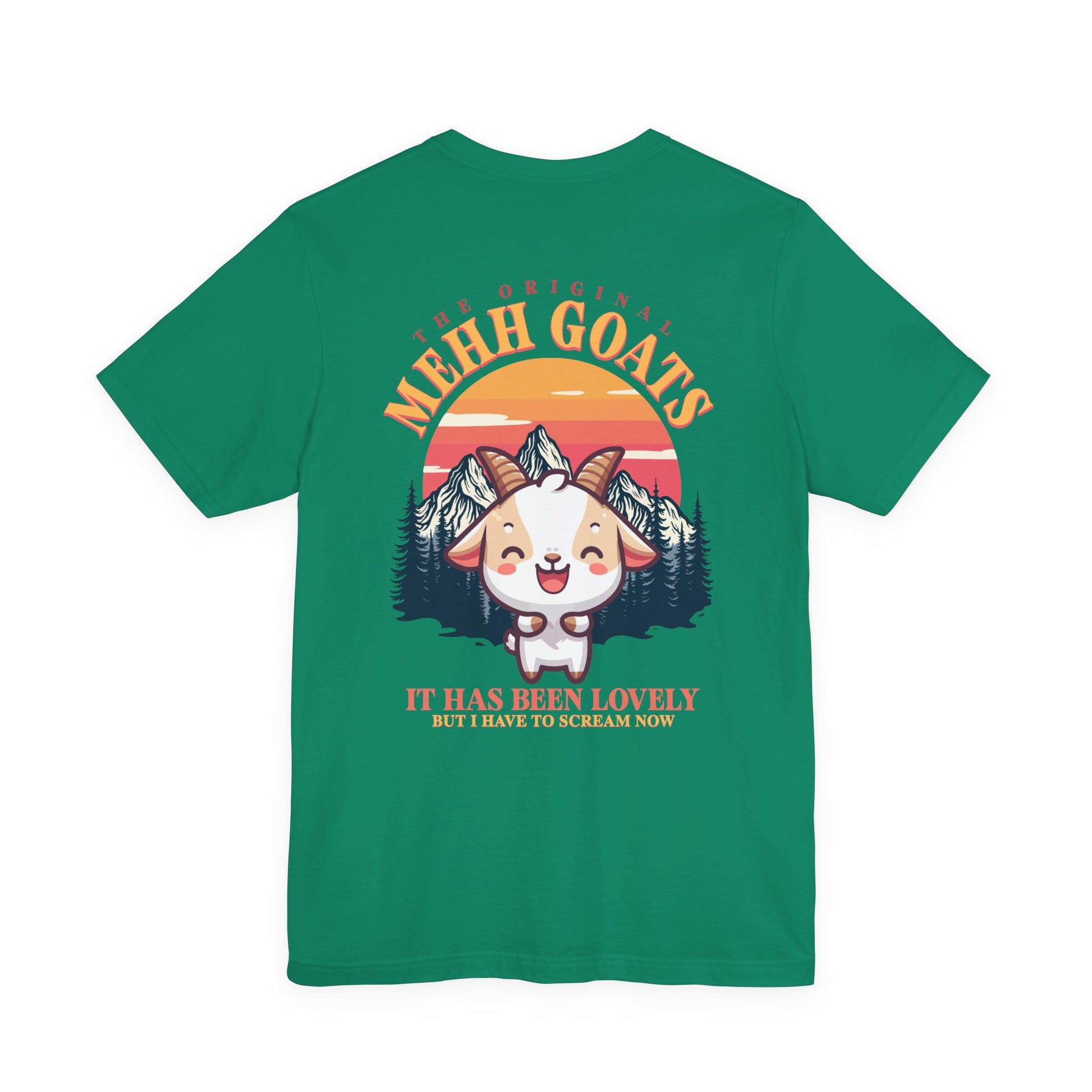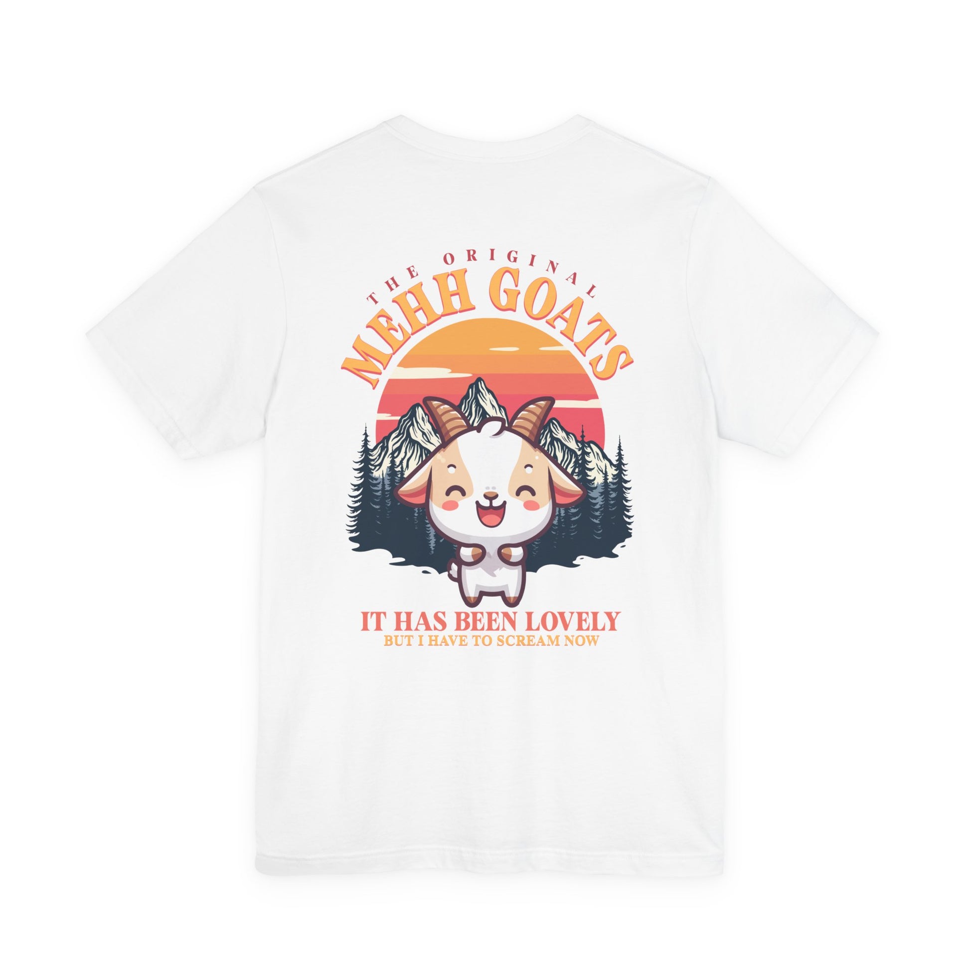 Celebrate joy and nature with this cheerful t-shirt featuring a happy goat standing on its back legs, laughing joyfully against a backdrop of mountains and pine trees. The playful text “The original MEHH GOATS” adds a touch of humor and personality to this fun design. Perfect for animal lovers, outdoor enthusiasts, and fans of quirky, lighthearted apparel. Made from soft, breathable fabric, it's ideal for casual wear or gifting to goat fans and nature lovers.