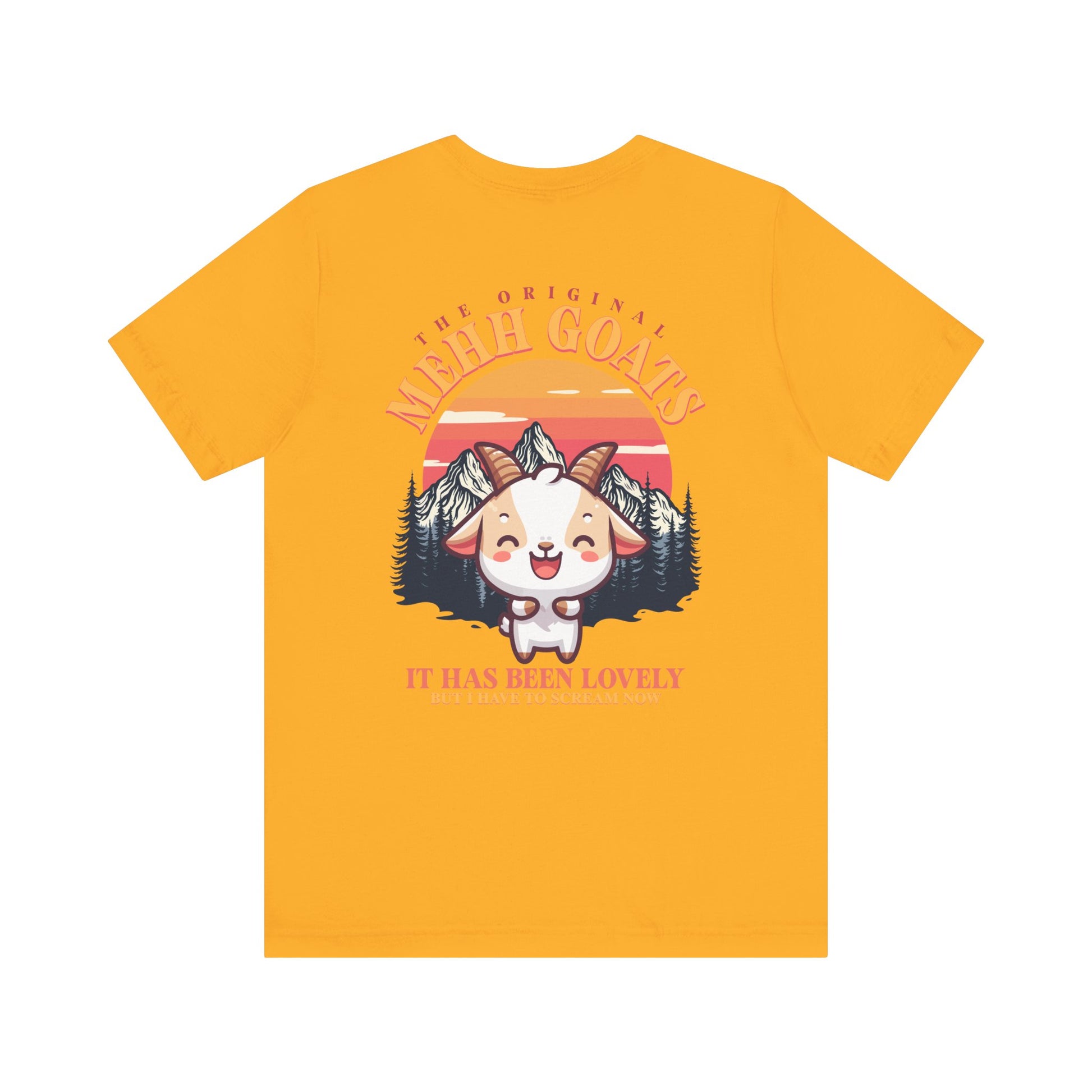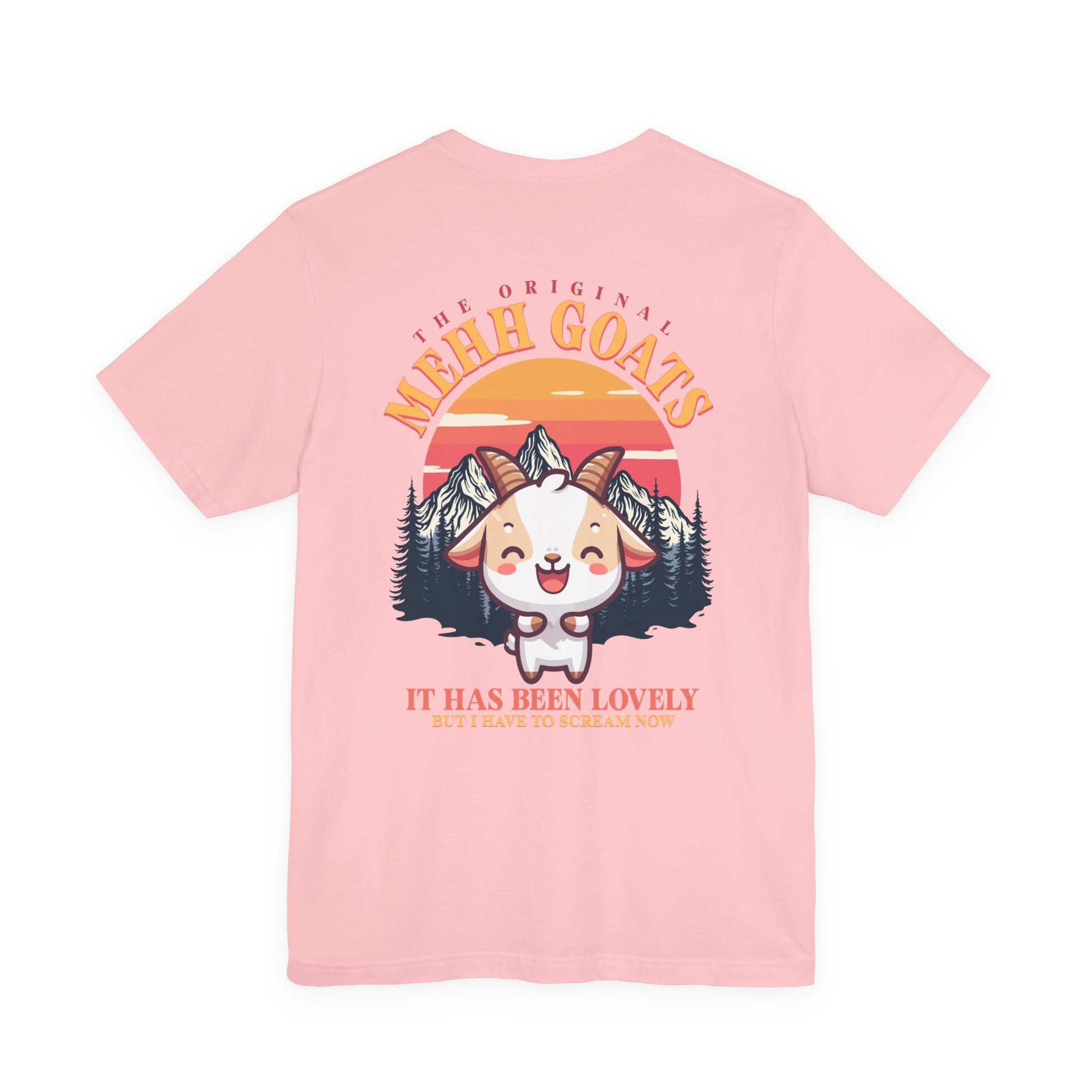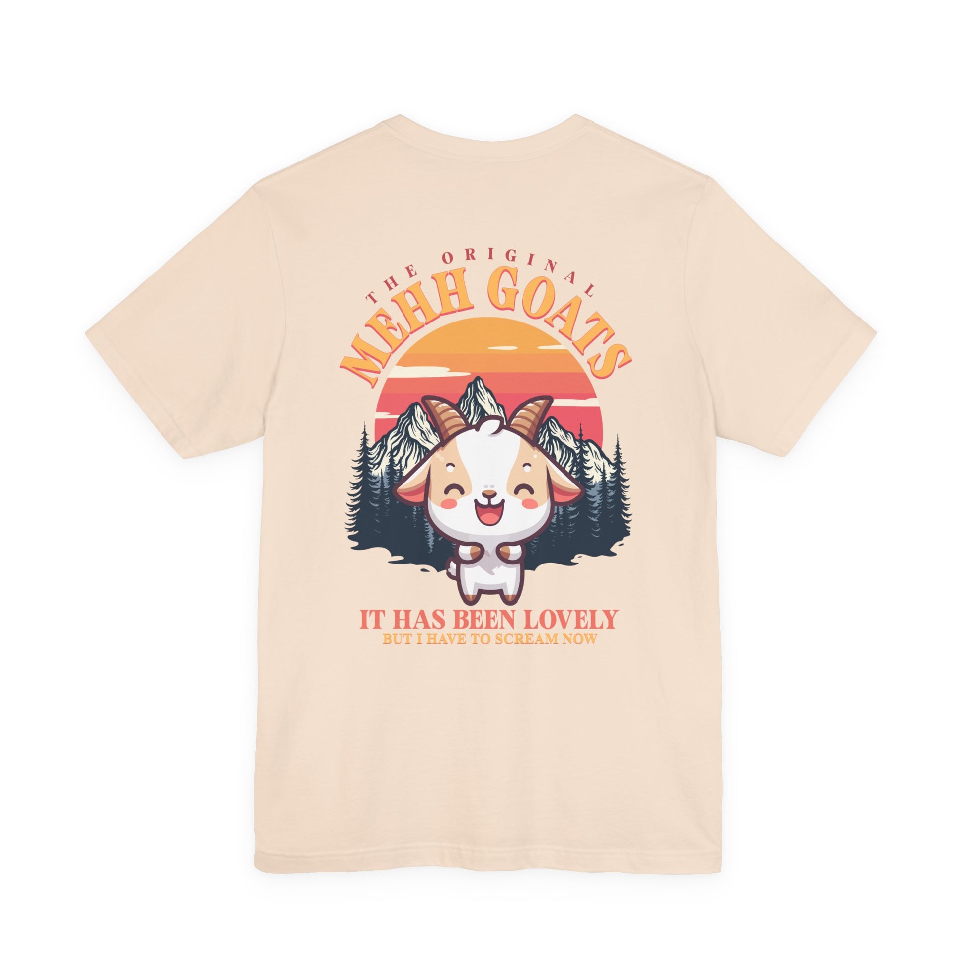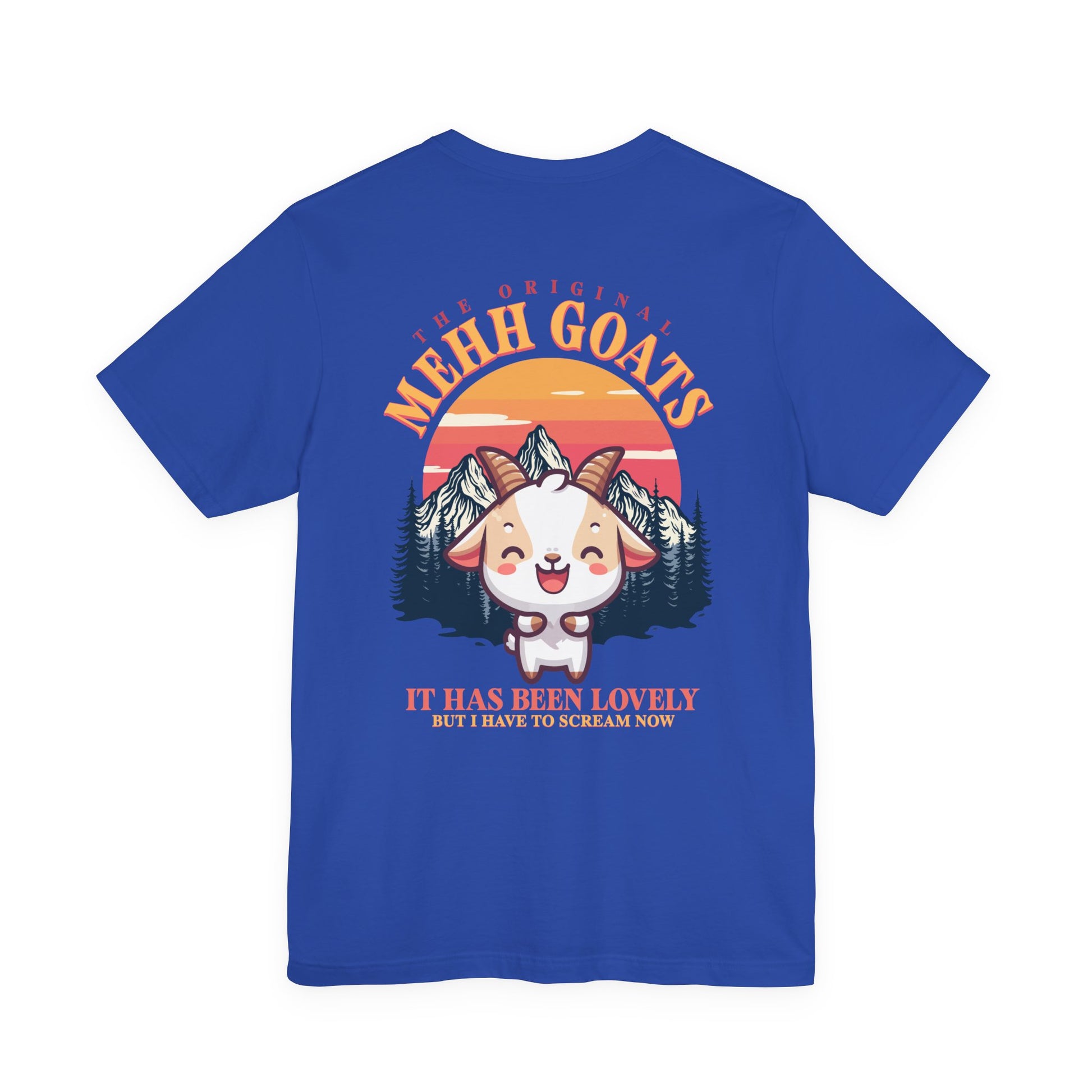 Celebrate joy and nature with this cheerful t-shirt featuring a happy goat standing on its back legs, laughing joyfully against a backdrop of mountains and pine trees. The playful text “The original MEHH GOATS” adds a touch of humor and personality to this fun design. Perfect for animal lovers, outdoor enthusiasts, and fans of quirky, lighthearted apparel. Made from soft, breathable fabric, it's ideal for casual wear or gifting to goat fans and nature lovers.