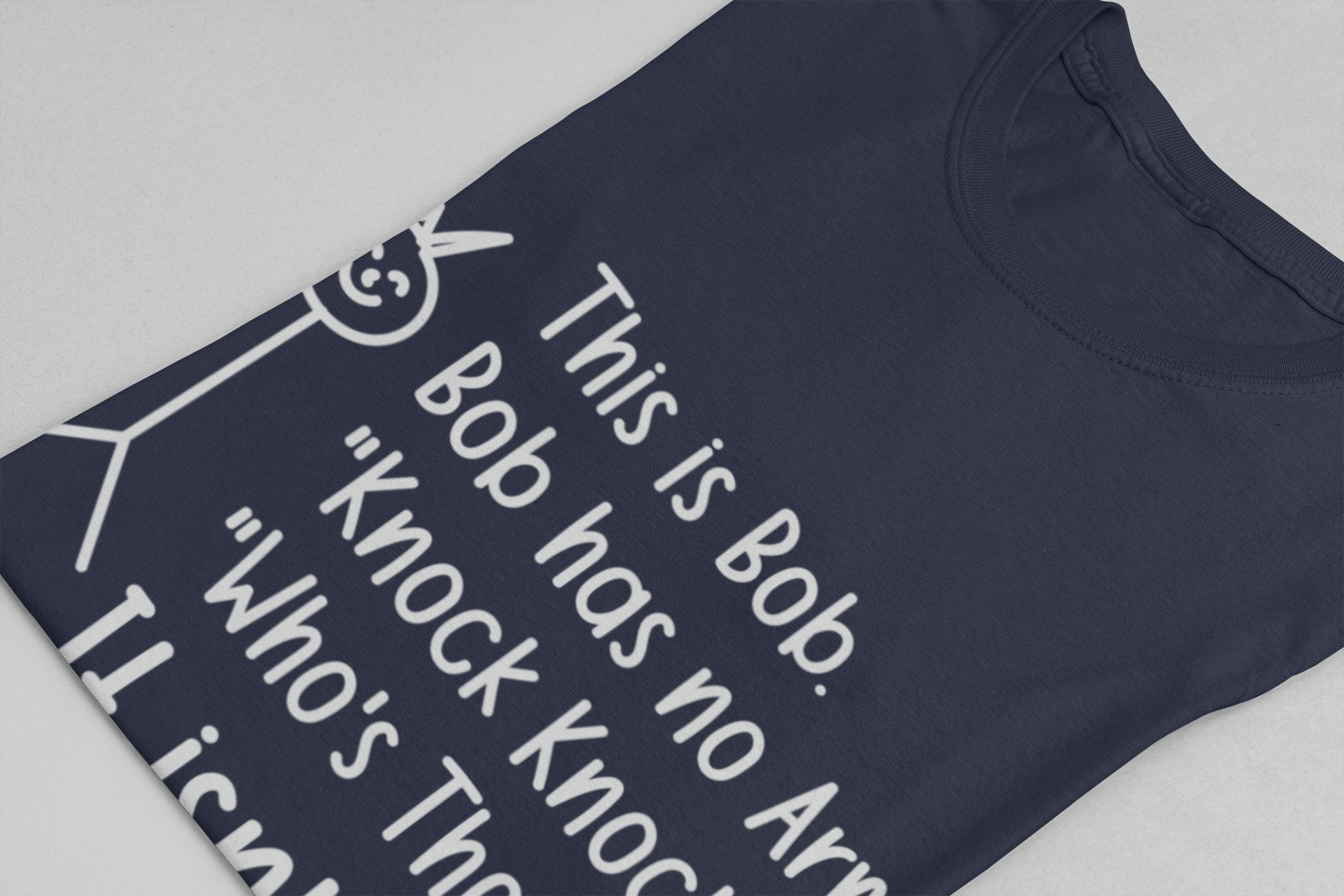 Make them laugh with this hilarious “This is Bob. Bob has no arms. Knock Knock. Who’s there? It isn’t Bob.” T-shirt! Featuring a simple stickman graphic with no arms, this shirt is perfect for fans of silly knock-knock jokes, witty humor, and light-hearted fun. A great casual gift that’s sure to break the ice and start conversations anywhere you go.
