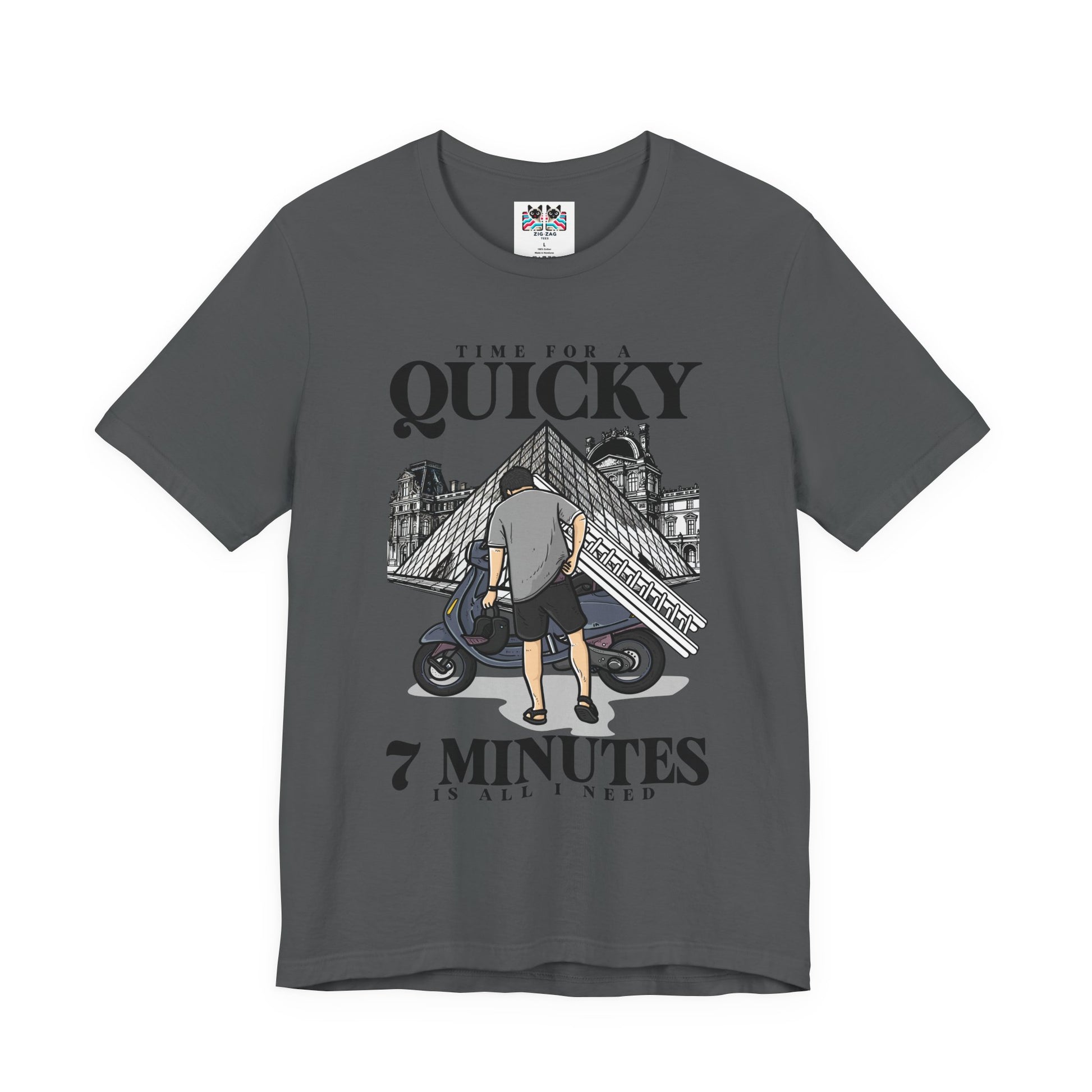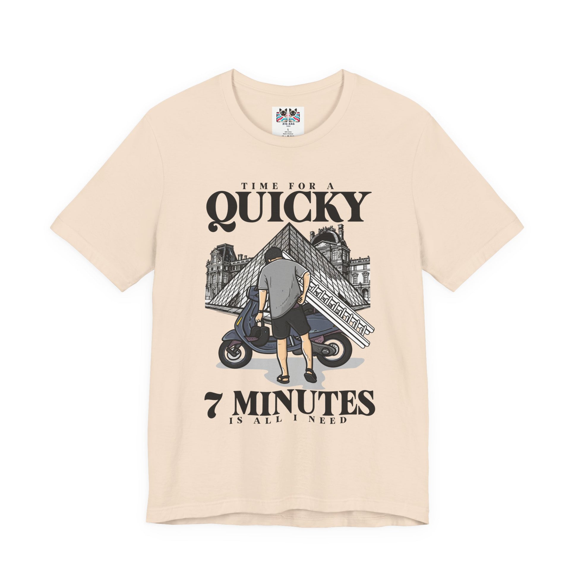 Get a laugh with this bold and clever t-shirt featuring a cartoon illustration of a man confidently walking towards a scooter rigged with a ladder, helmet in hand, set against the iconic Louvre Museum backdrop. Above the scene, large script proclaims "Time for a Quicky"—with the mischievous caption "7 minutes is all I need" underneath. This playful design is perfect for anyone who appreciates art-inspired humor, fast getaways, or French caper culture.
