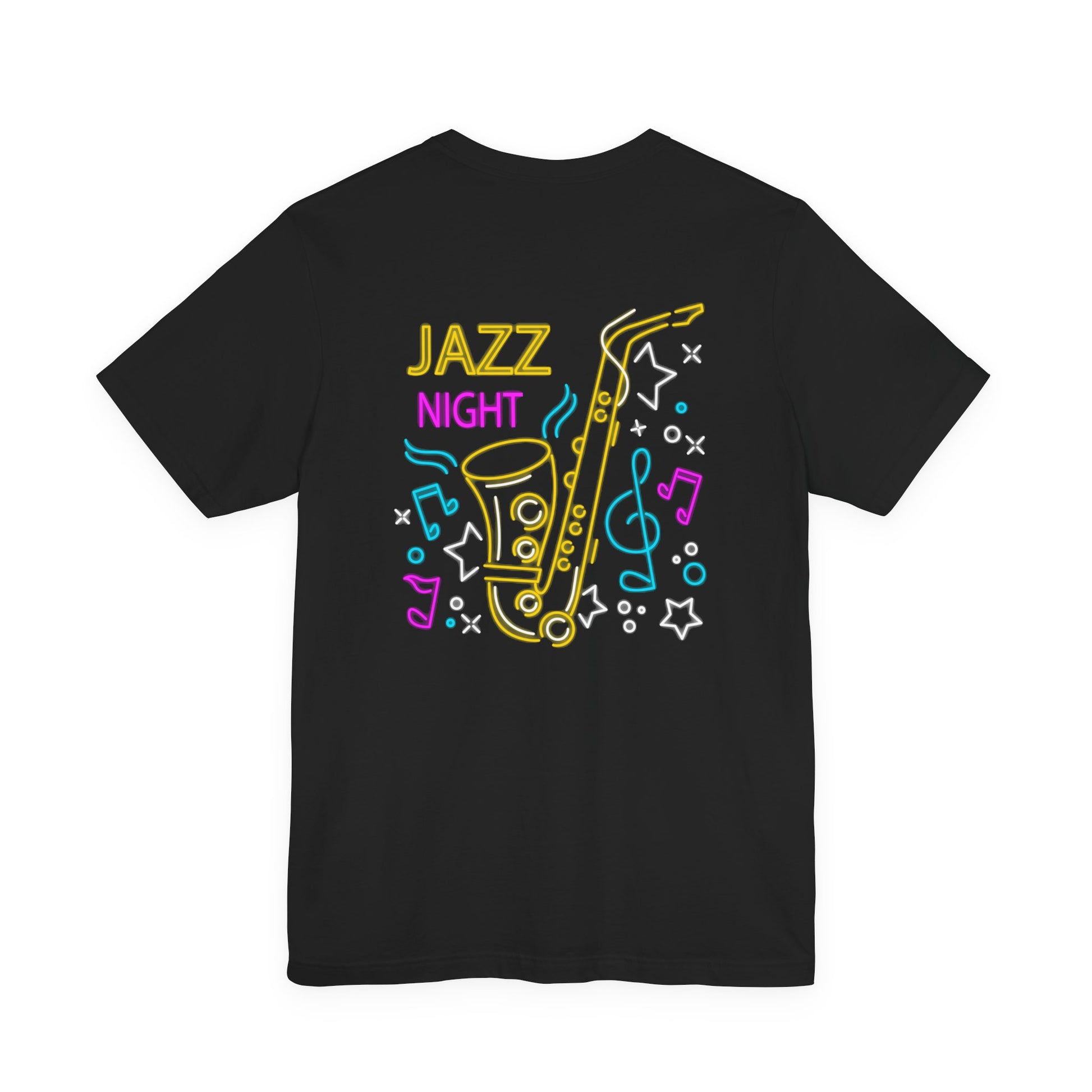 Description: Light up the night with this neon-style Jazz Night t-shirt featuring a vibrant saxophone surrounded by colorful music notes and stars on both front and back. Perfect for jazz lovers, musicians, saxophone players, and concert-goers, this bold graphic tee captures the energy of live music and late-night jam sessions. Ideal for gigs, festivals, jazz clubs, or as a unique gift for any music fan who loves smooth sax sounds and retro neon vibes.