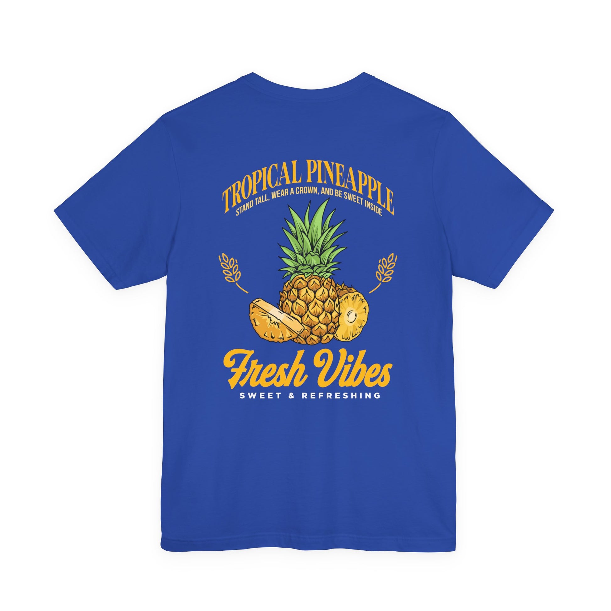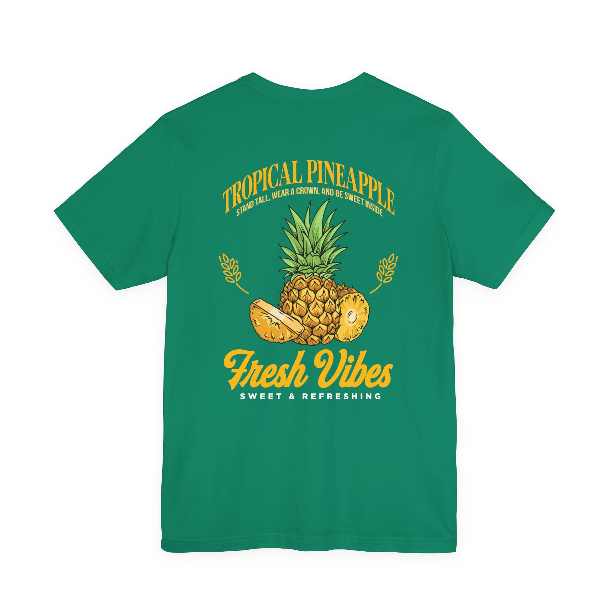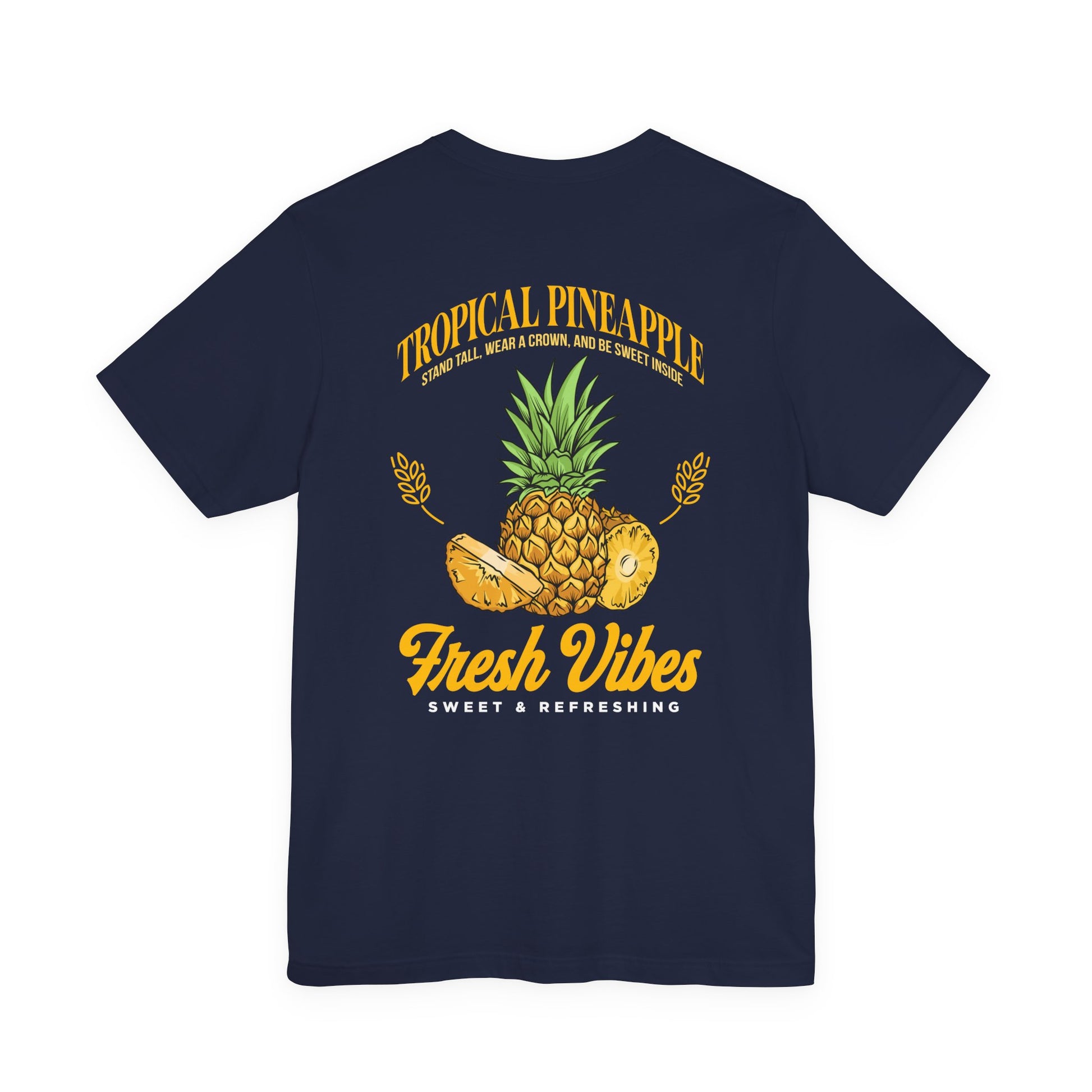 This vibrant tshirt features a large graphic of a whole pineapple and a half-cut pineapple, highlighting the tropical fruit’s sweet and refreshing appeal. The bold text "Tropical Pineapple" at the top and "Fresh Vibes" at the bottom capture the lively and sunny spirit of tropical freshness, perfect for fruit lovers and summer enthusiasts.