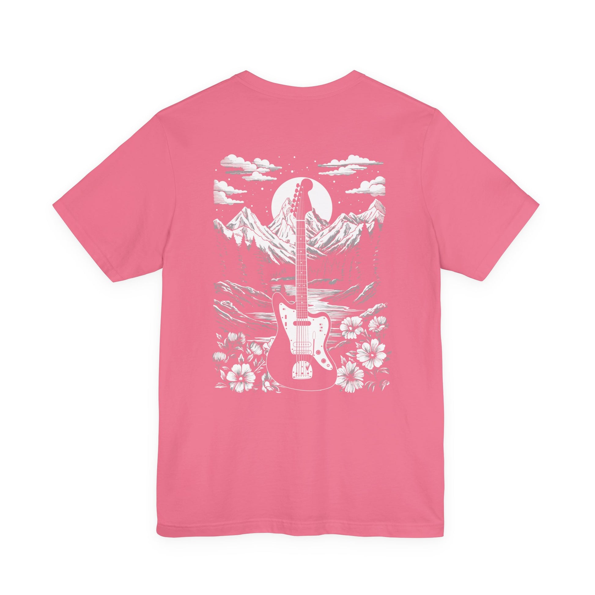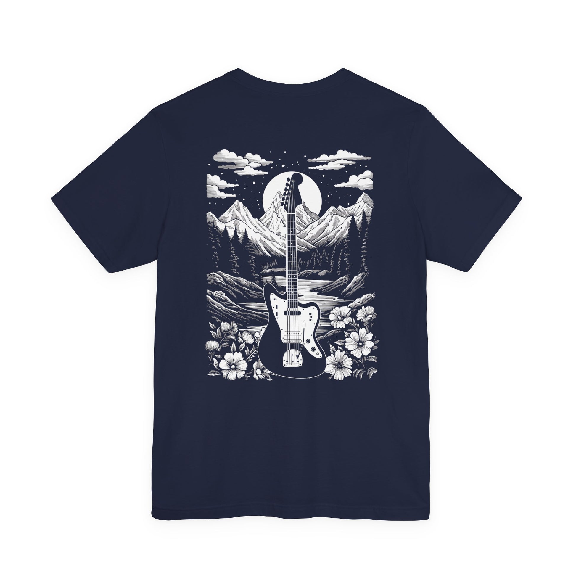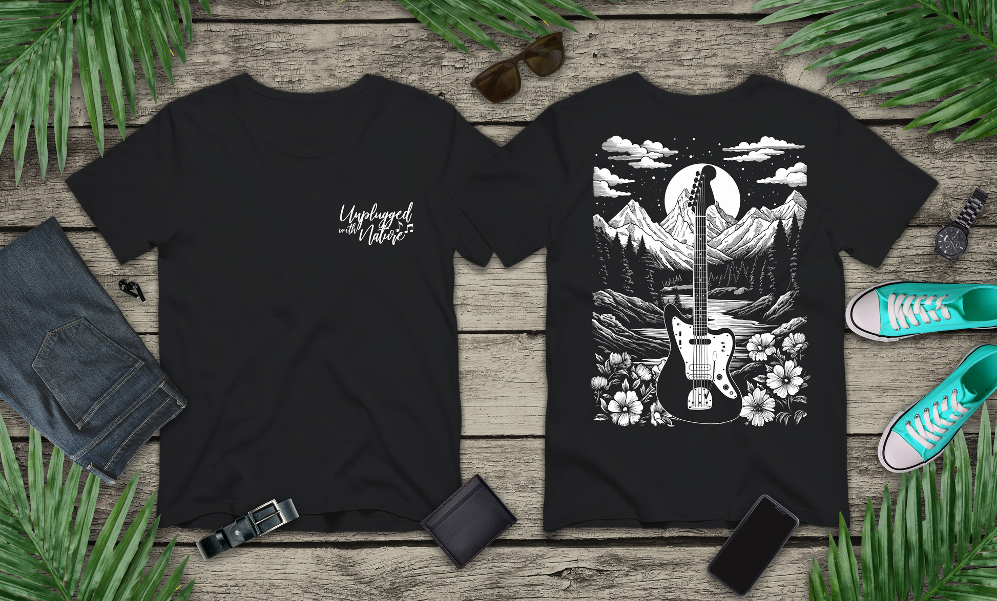 Show your harmony with the outdoors and your love for music with this beautifully illustrated t-shirt. The front features the inspiring phrase "Unplugged with Nature" with musical notes drifting around, paired with a striking graphic of a guitar standing upright against a backdrop of black and white mountains, a full moon, rivers, clouds, trees, and blooming flowers. This nature-meets-music design is perfect for musicians, hikers, and anyone who finds peace from unplugging and tuning in to the beauty around them.