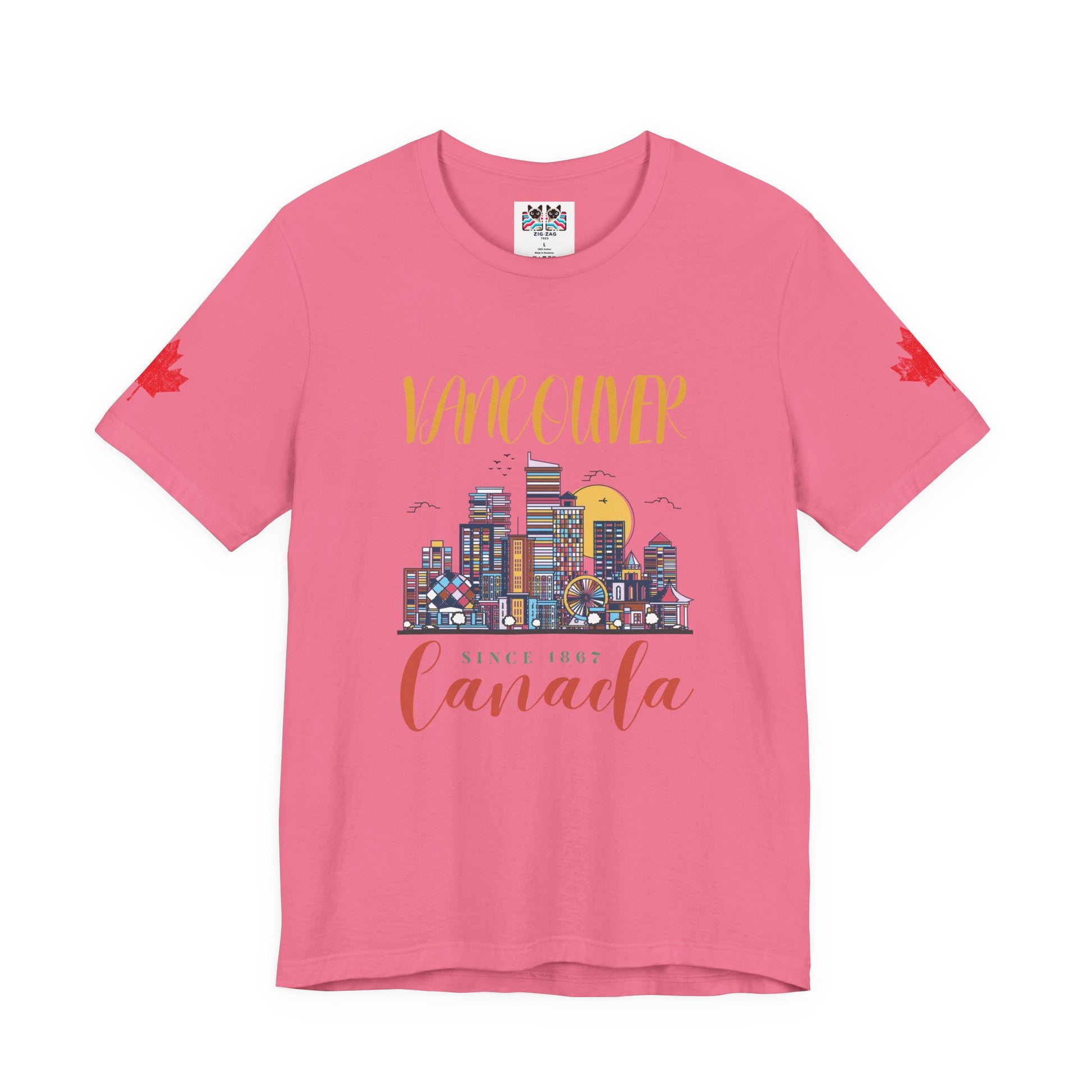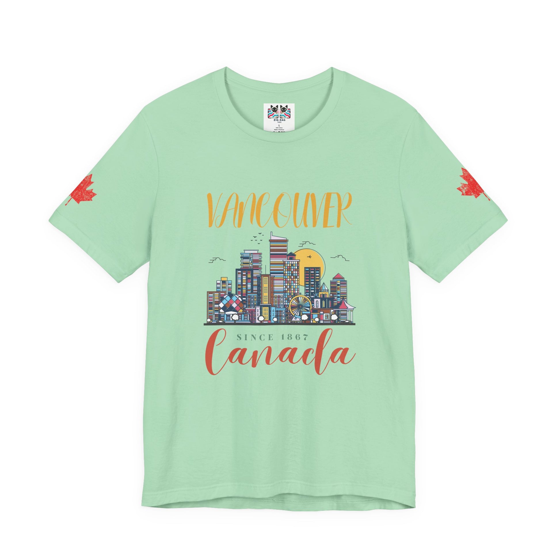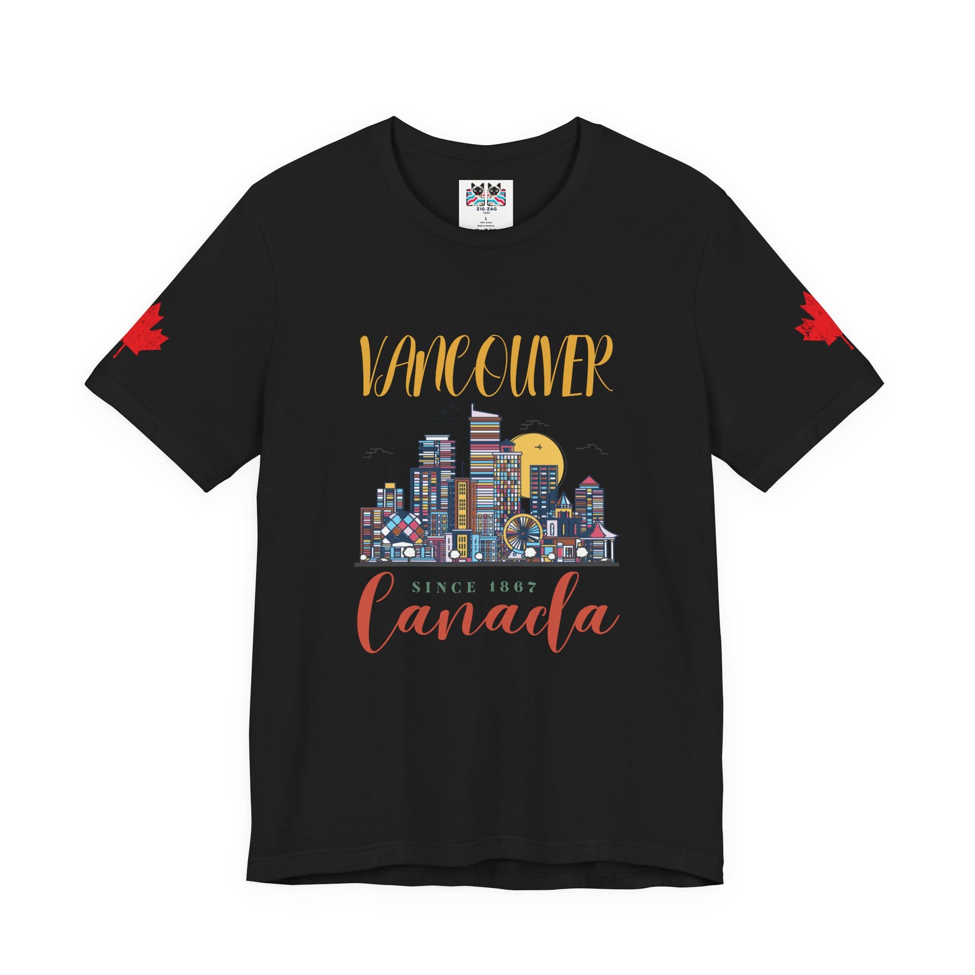 Celebrate the vibrant city of Vancouver with this artistic t-shirt featuring a colorful skyline illustration. Iconic buildings, a golden sun, birds, and the city’s unique energy are beautifully rendered on the chest, along with stylish lettering: “Vancouver” on top and “Canada Since 1867” below. Maple leaves accent both sleeves for added patriotic flair. Perfect for locals, tourists, and anyone who loves urban Canadian culture and Vancouver's rich heritage.