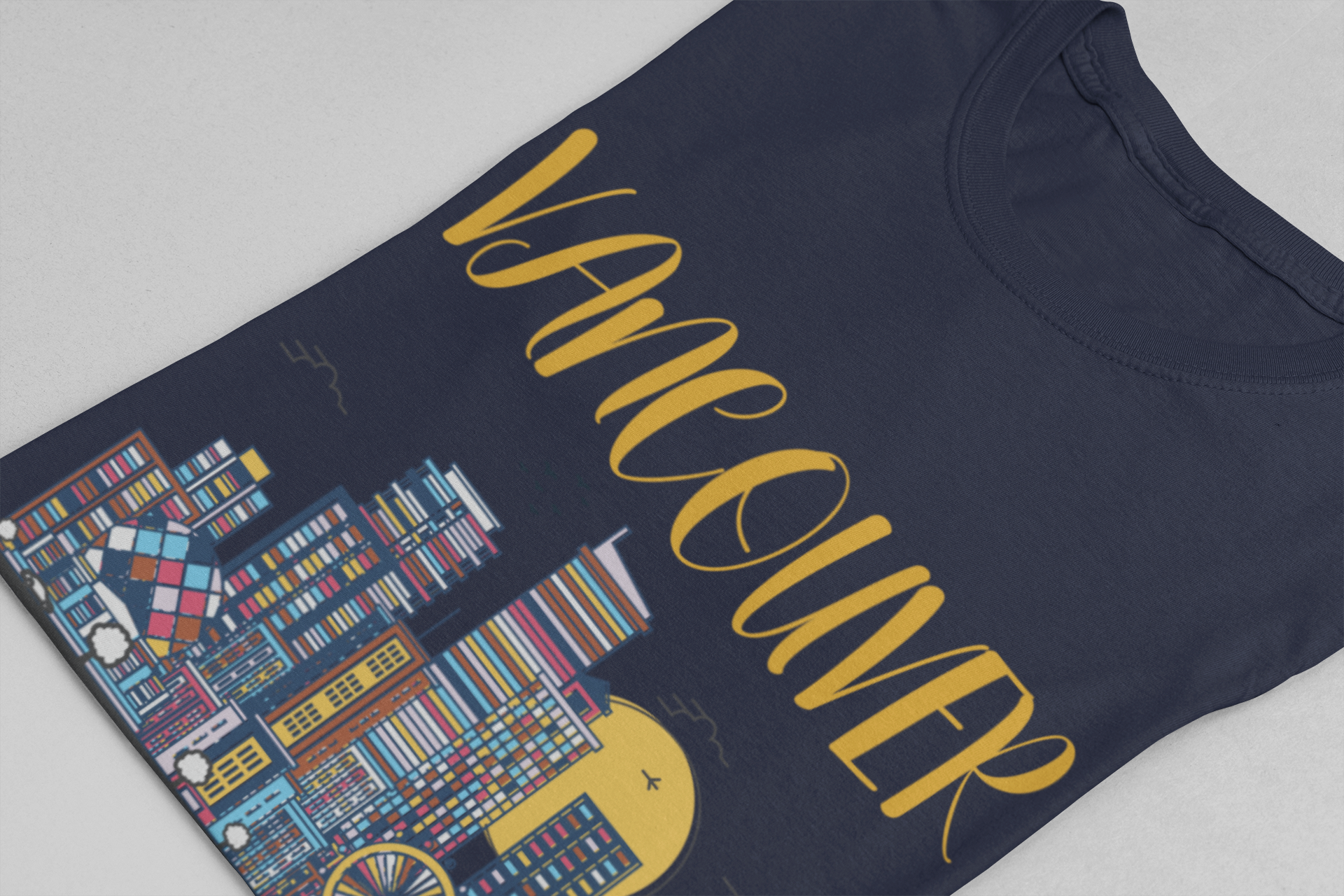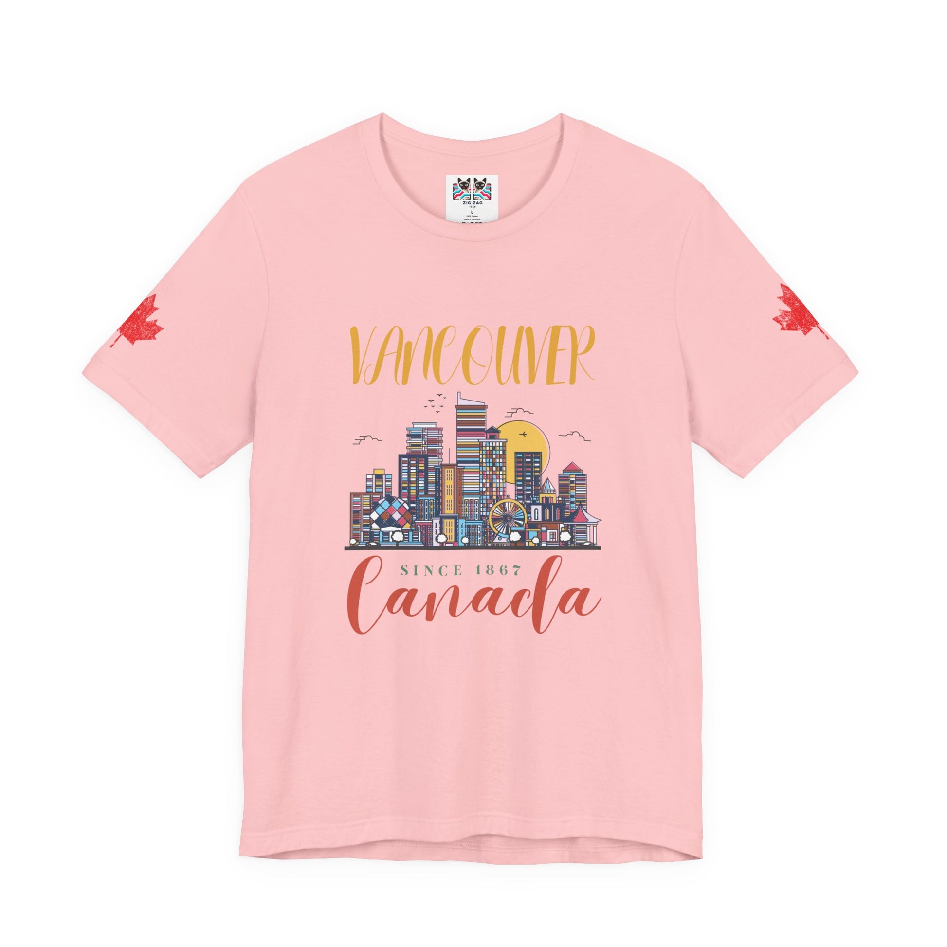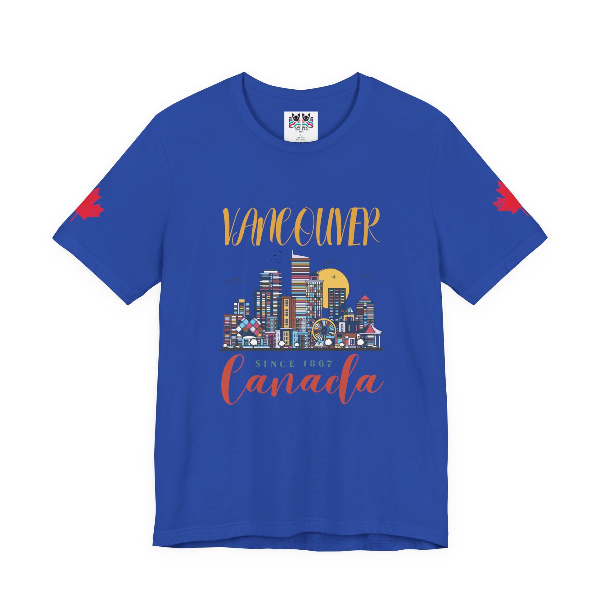 Celebrate the vibrant city of Vancouver with this artistic t-shirt featuring a colorful skyline illustration. Iconic buildings, a golden sun, birds, and the city’s unique energy are beautifully rendered on the chest, along with stylish lettering: “Vancouver” on top and “Canada Since 1867” below. Maple leaves accent both sleeves for added patriotic flair. Perfect for locals, tourists, and anyone who loves urban Canadian culture and Vancouver's rich heritage.