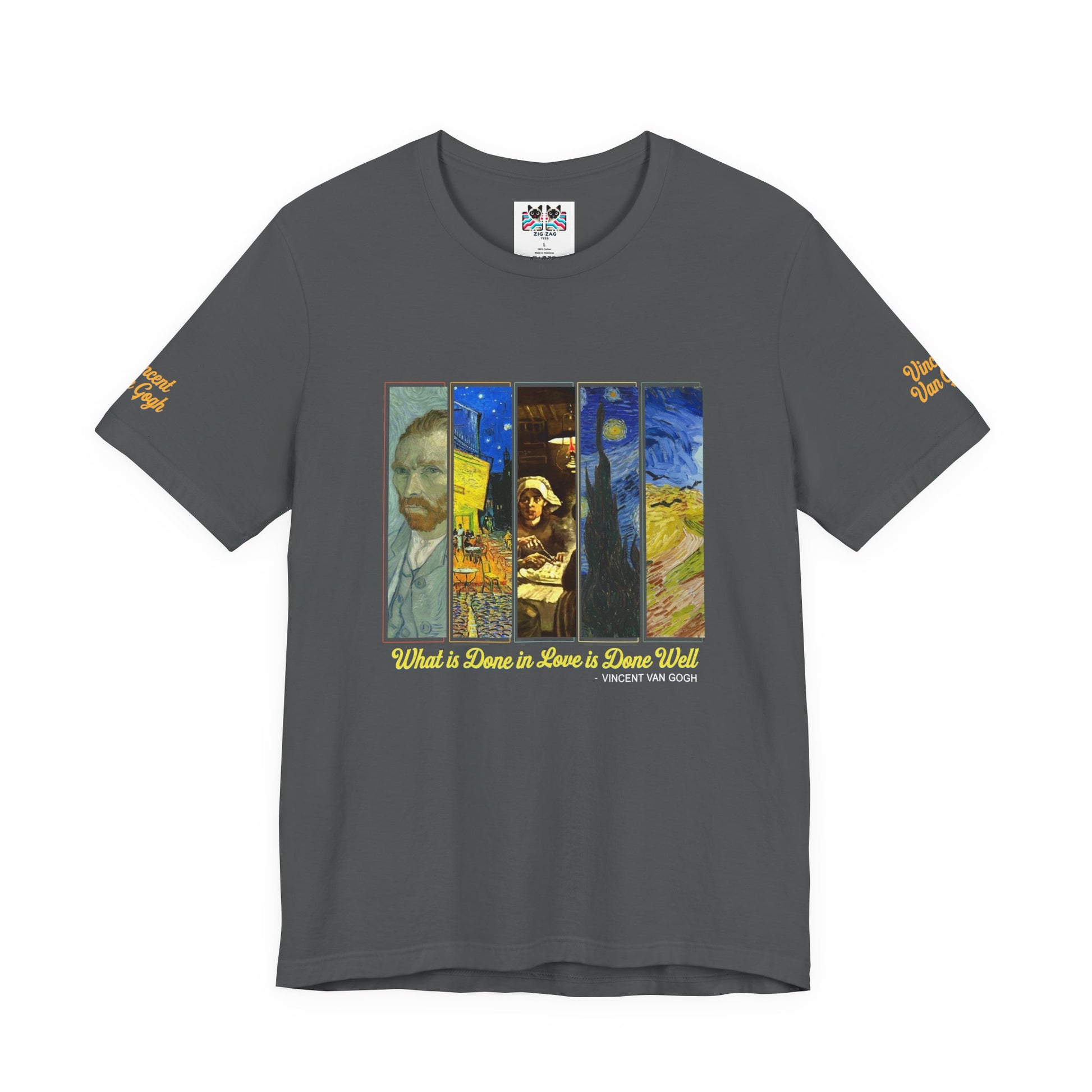 Perfect for art teachers, artists, museum visits, creative workshops, or everyday wear for Van Gogh admirers. Features "Vincent Van Gogh" signature-style sleeve accents in golden yellow. The unisex fit is designed for all body types. A meaningful gift for artists, art students, Van Gogh fans, and passionate creators.