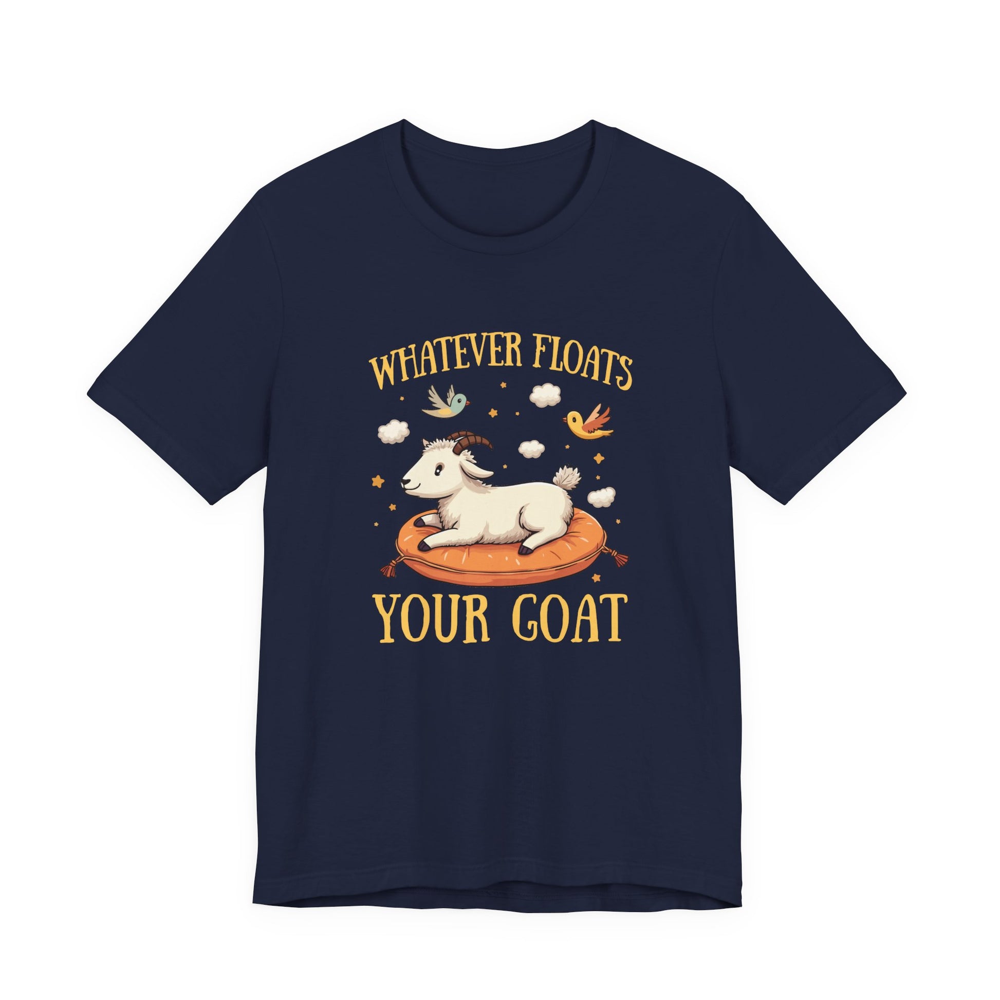 Add a playful twist to your style with this unique t shirt, featuring a goat happily floating in the air atop a comfortable, air-filled cushion. Surrounded by small clouds and cheerful birds, this whimsical scene captures carefree joy. The bold text "Whatever floats your goat" adds a humorous pun, making this tee perfect for animal lovers, those who appreciate fun sayings, or anyone seeking a lighthearted touch to their wardrobe. Made from soft, high-quality fabric, it's ideal for casual wear, gifts, or goat-themed events.