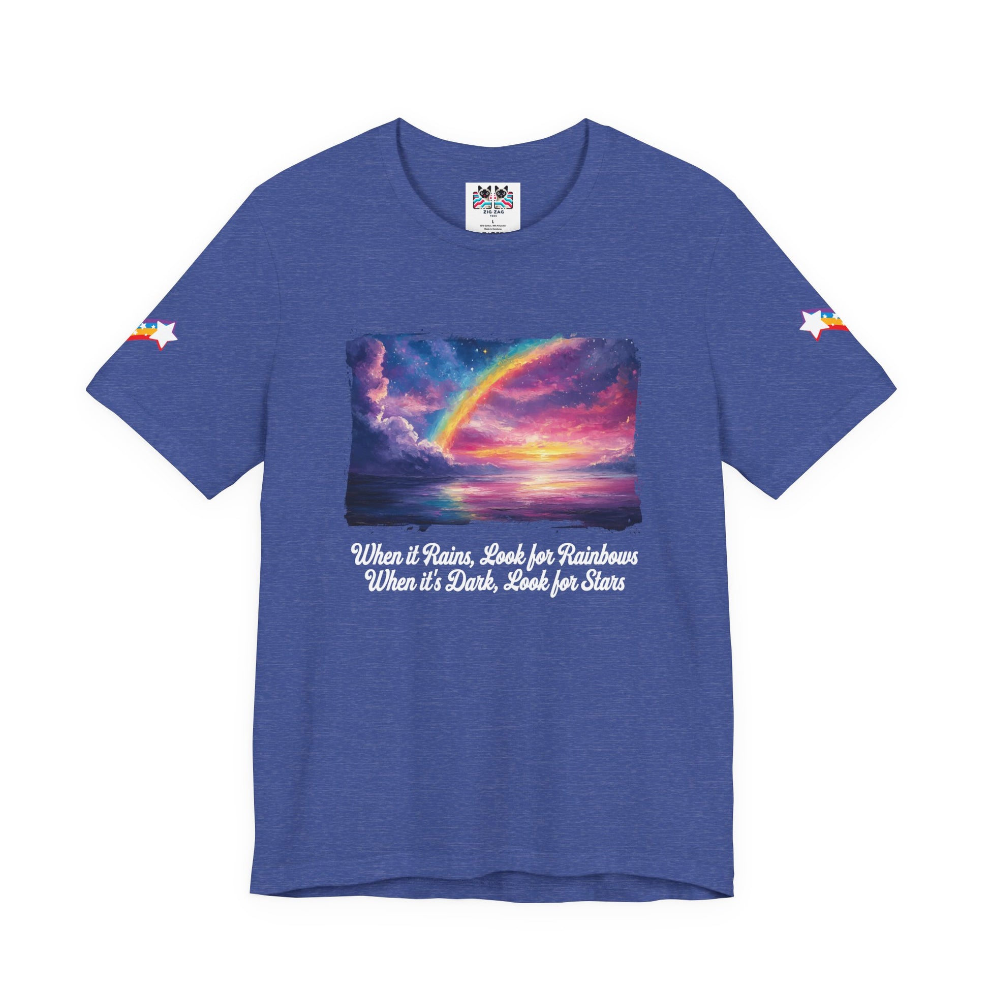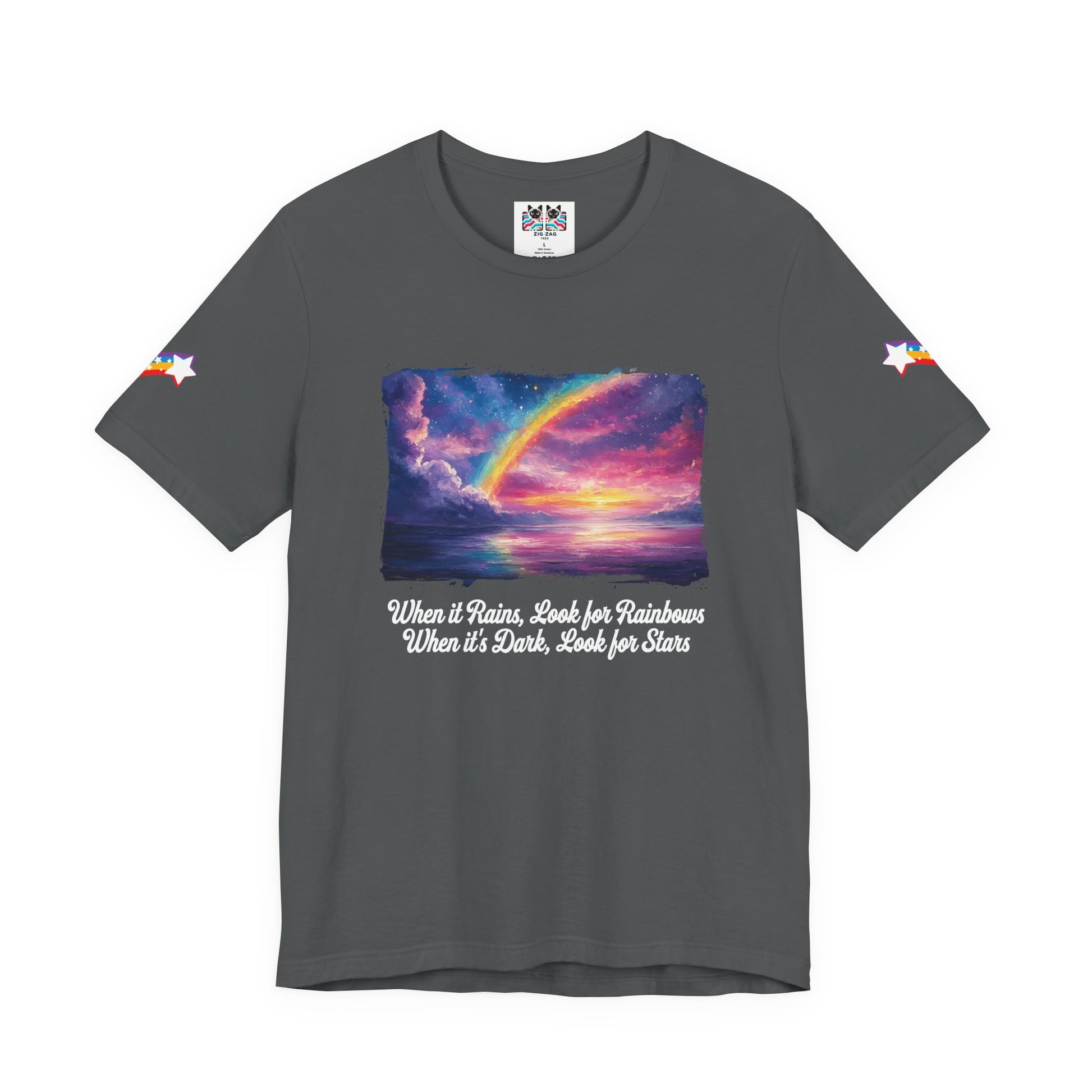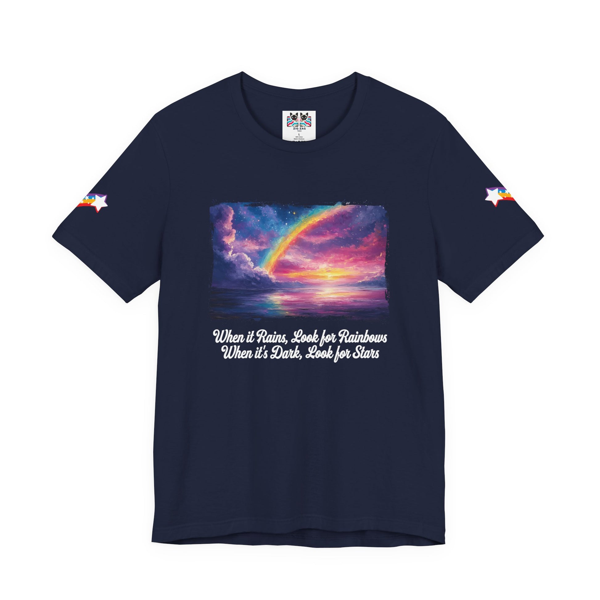 Find beauty in life's storms with this uplifting "When it Rains, Look for Rainbows - When it's Dark, Look for Stars" t-shirt featuring a breathtaking scene of a vibrant rainbow arcing over a purple-pink sunset ocean. This beloved inspirational quote reminds us to seek hope, beauty, and light even during our darkest moments.
